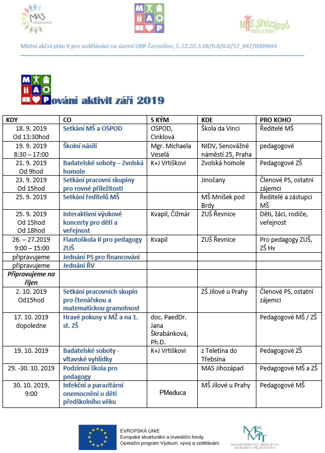 MAPování aktivit na září by Hana Barboříková · Published 16.8.2019 · Updated 16 srpna, 2019 Přinášíme přehled plánovaných aktivit v projektu na měsíc září a plán na říjen 2019.